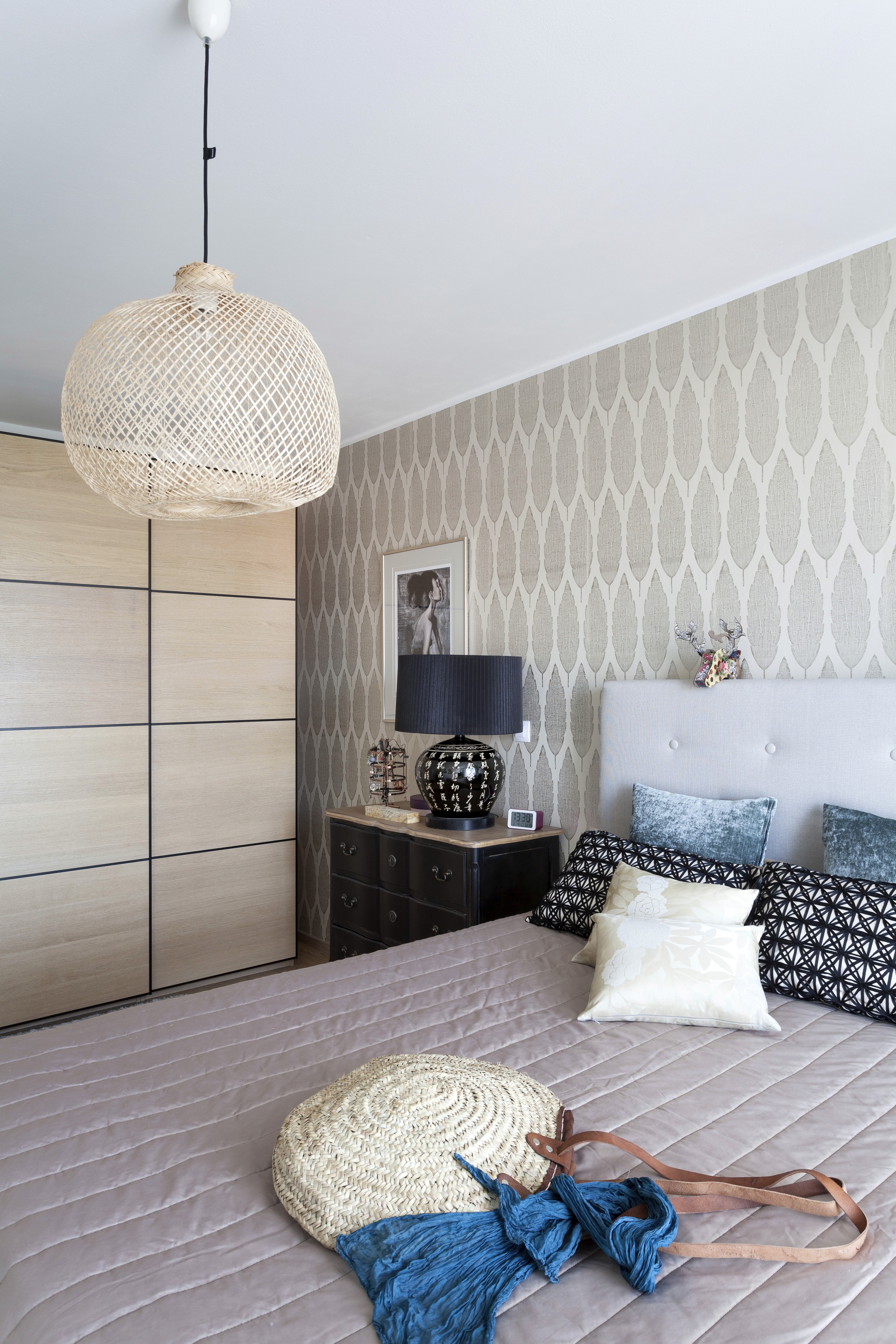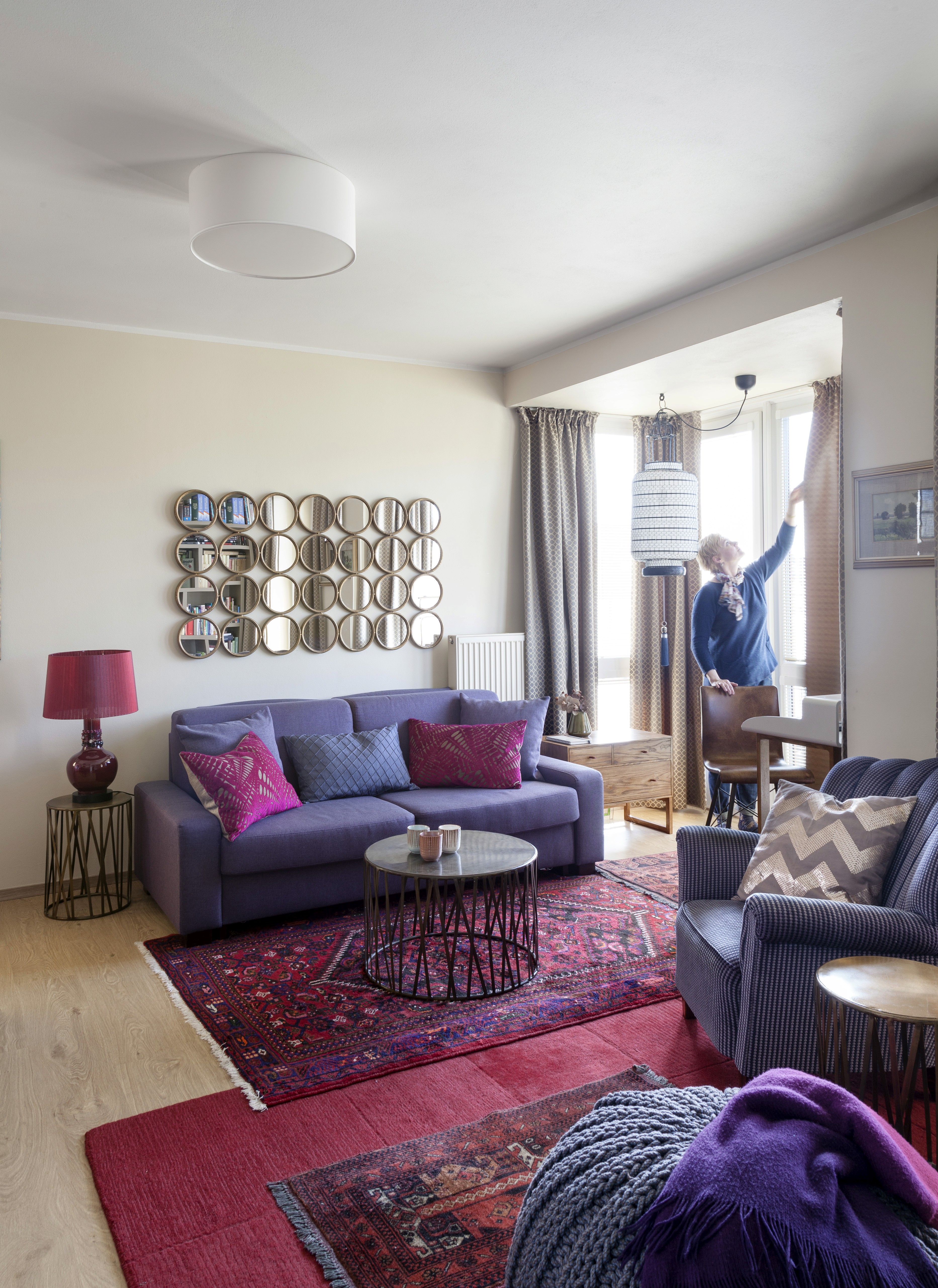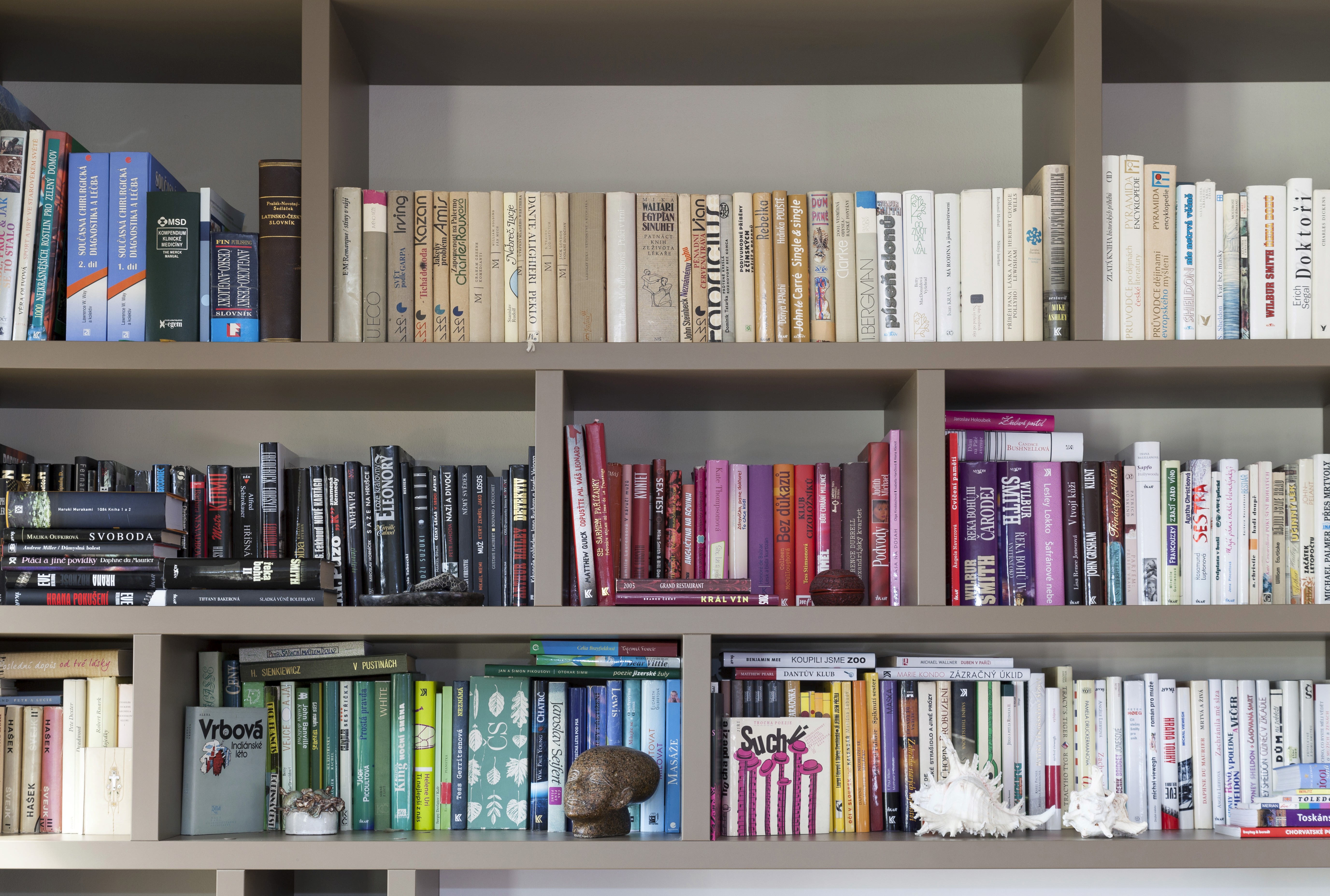 Většinou klientům radím, ať výrazné barvy používají na jednotlivých samostatných věcech, které se dají snadno změnit nebo stěny přemalovat. Tímto bytem ve třech částech, které na sebe navazují, naopak „protéká“ výrazně energická barevnost. Poté, co se majitelka osmělila s jemně růžovou barvou lamina v kuchyni, se nadchla k pořízení fialové pohovky české výroby od místní firmy. Dalším důvodem pro výrazné barvy v interiéru byla skutečnost, že majitelka už měla z předchozího bytu výraznou červenou lampu a křeslo, které potřebovalo přečalounit. V prosvětleném arkýři vznikl prostor pro drobný pracovní stolek a ořechovou masivní komodu od uměleckého truhláře na míru. Drobnosti i větší předměty se tedy uložily do ní i do knihovny na míru. Knihy vyskládané podle barev podtrhují neotřelý a odvážný vkus majitelky bytu. Pro návrh ložnice byla určující stávající černá lampa, touha po elegantní tapetě a pohodlné posteli.
