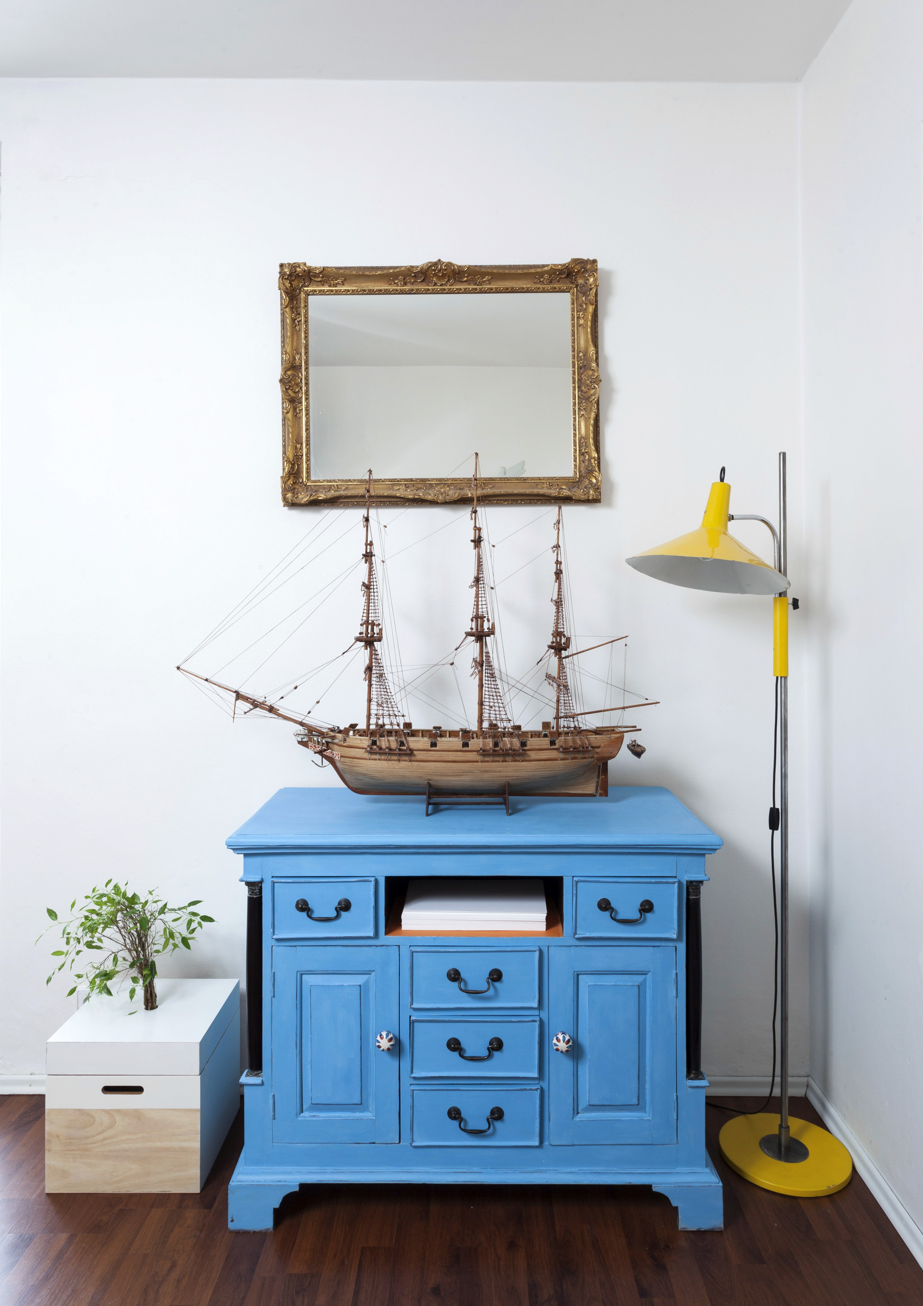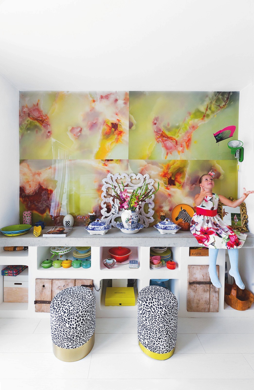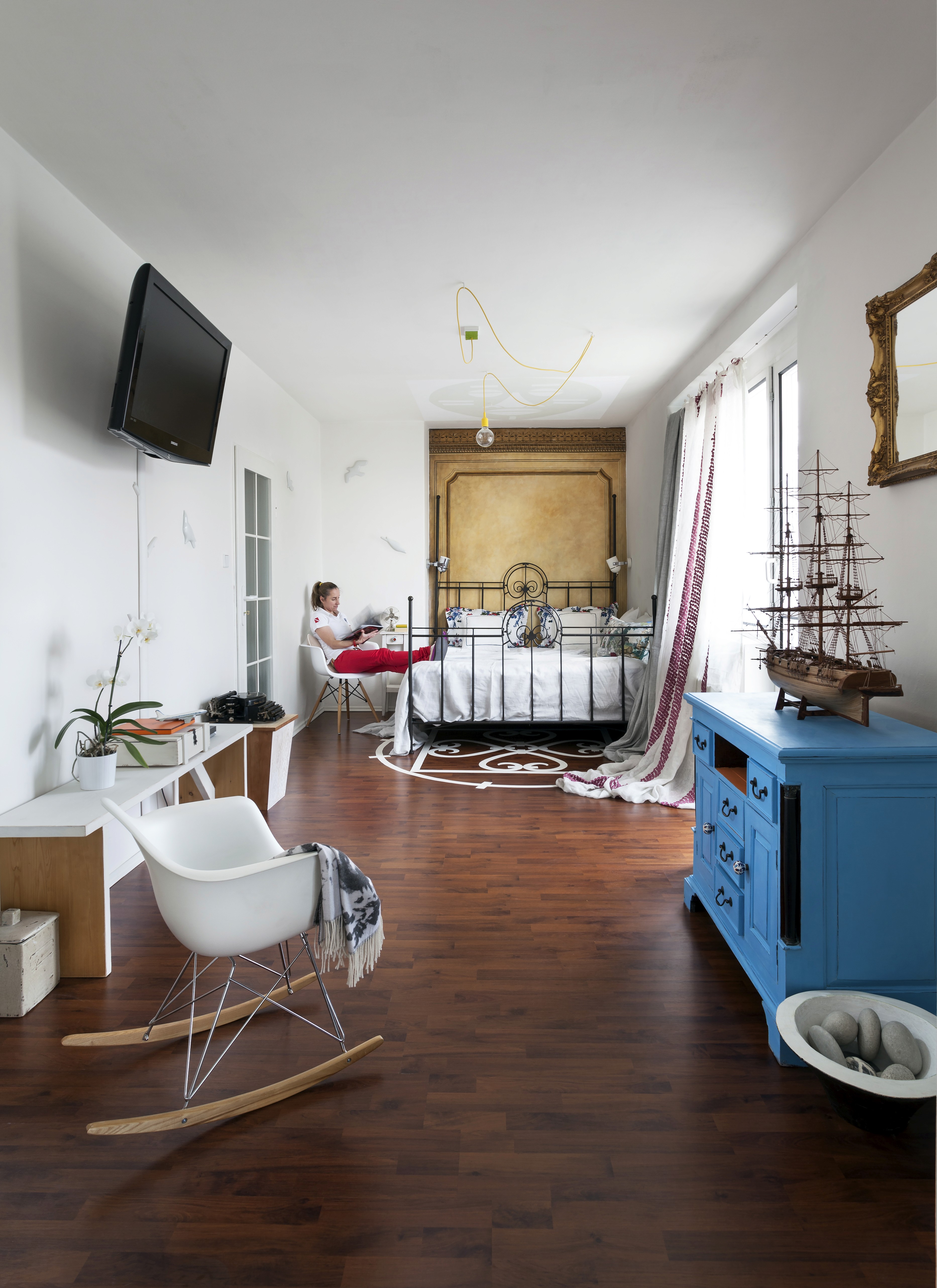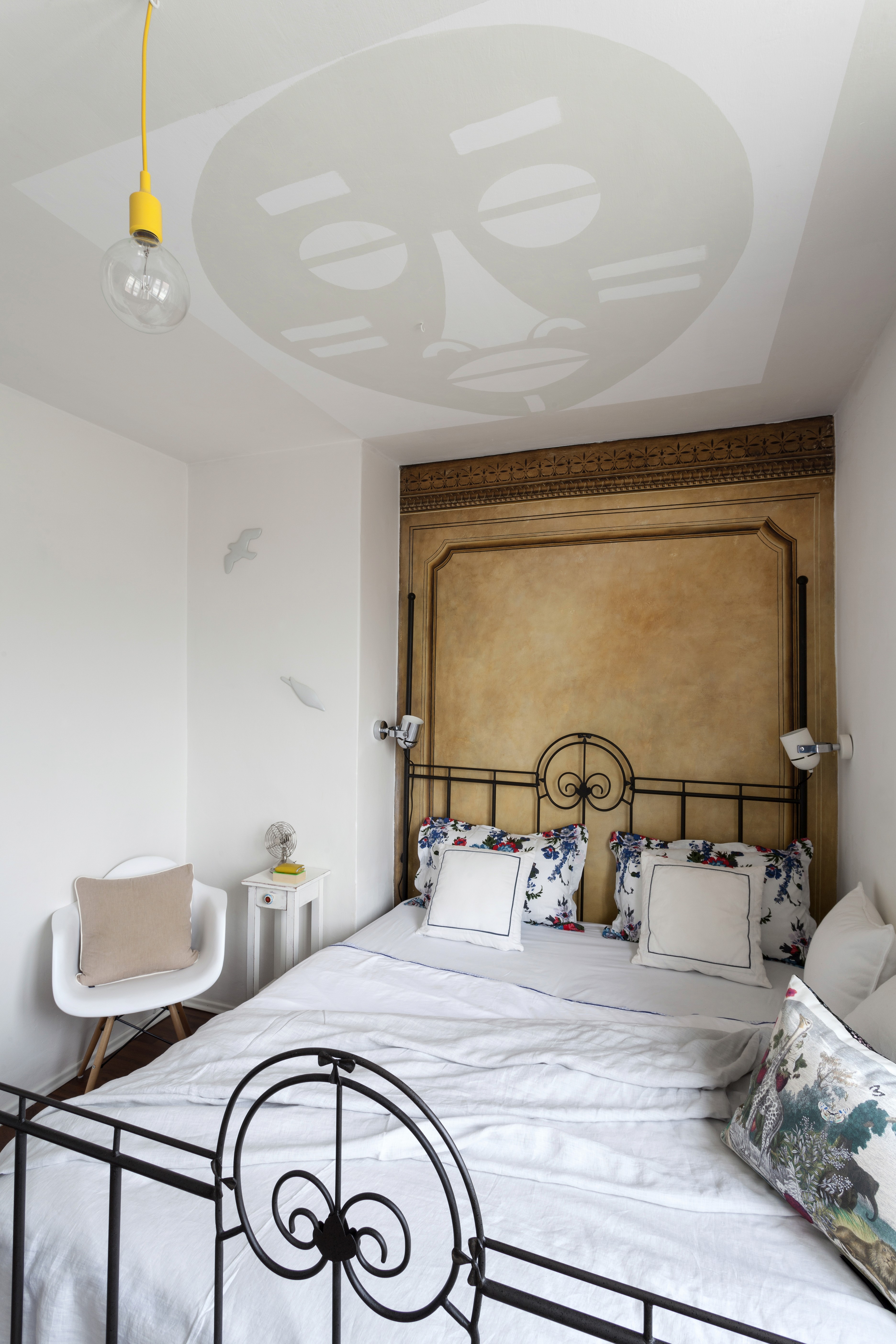 Bílá podlaha je tak krásná a tak málo klientů se odváží si ji pořídit. Ale když chcete dát zvlášť vyniknout jasným barvám vašeho nábytku a doplňků a máte ještě k tomu umělecké sklony, pak je bílý prostor jako bílé plátno vašeho domácího života. Mimo to, že tím samozřejmě maximálně opticky zvětšíte prostor. Přestože je majitelka tohoto bytu neskutečně nadaná umělkyně, oslovila mě s prosbou o dohled a názor nad jejím plánem prostory přetvořit, tak aby vzniklo důstojné sezení u stolu, pracovní řemeslný stůl v kuchyni, naproti nový úložný prostor a ve vedlejším otevřeném prostoru nová dělicí posuvná zástěna, dětský koutek a naprosto výjimečná atmosféra ložnicové části s benátskou freskou a stylizovanou maskou na stropě. Zbývalo namalovat ornament na kontrastní podlahu a pro zpestření holandský motiv krajinky z porcelánu a byt byl zase na nějaký čas pocitově hotový. Jen do té doby, než umělkyni políbí další Múza.