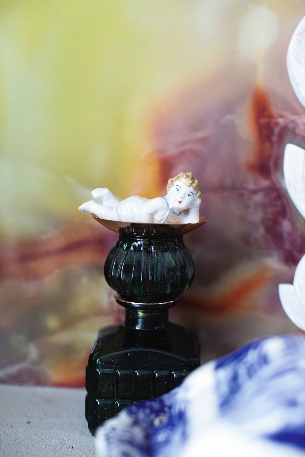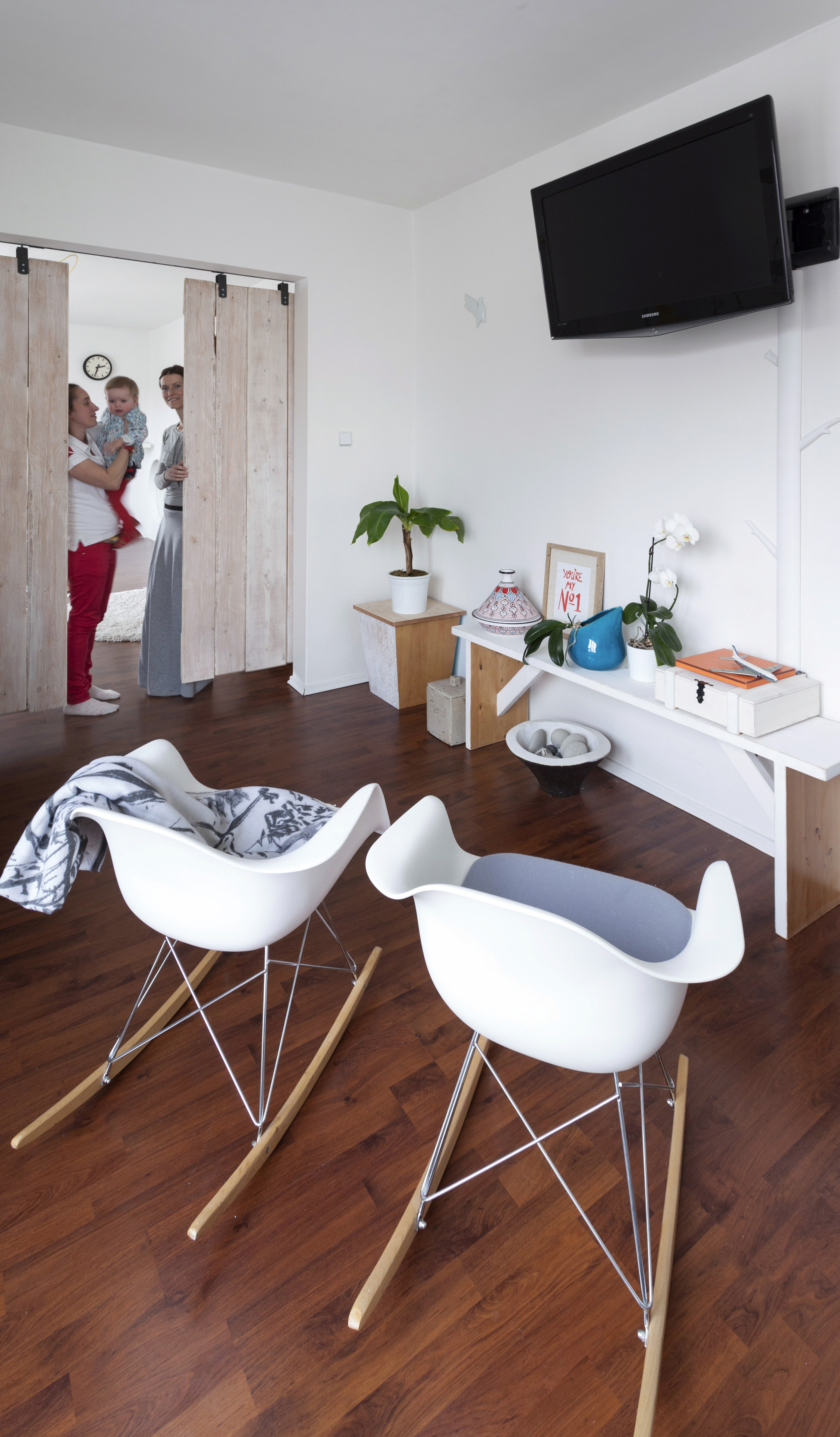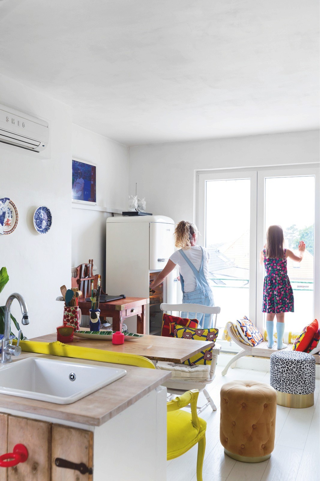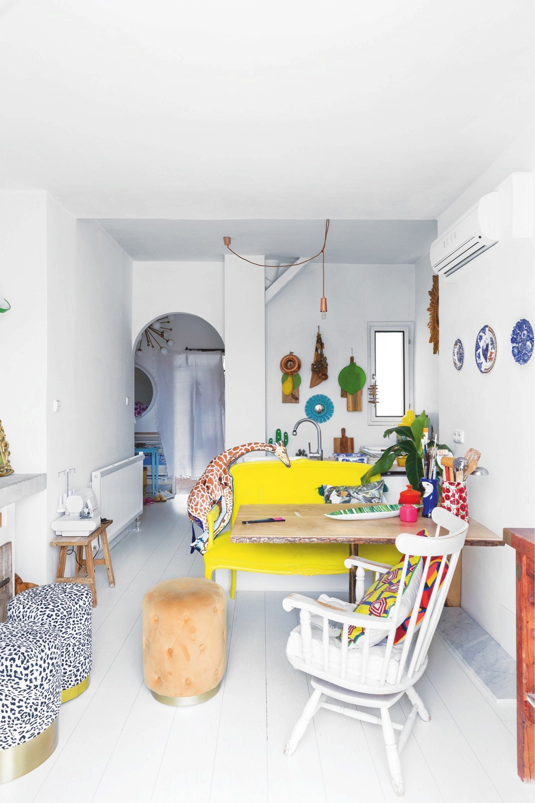 Bílá podlaha je tak krásná a tak málo klientů se odváží si ji pořídit. Ale když chcete dát zvlášť vyniknout jasným barvám vašeho nábytku a doplňků a máte ještě k tomu umělecké sklony, pak je bílý prostor jako bílé plátno vašeho domácího života. Mimo to, že tím samozřejmě maximálně opticky zvětšíte prostor. Přestože je majitelka tohoto bytu neskutečně nadaná umělkyně, oslovila mě s prosbou o dohled a názor nad jejím plánem prostory přetvořit, tak aby vzniklo důstojné sezení u stolu, pracovní řemeslný stůl v kuchyni, naproti nový úložný prostor a ve vedlejším otevřeném prostoru nová dělicí posuvná zástěna, dětský koutek a naprosto výjimečná atmosféra ložnicové části s benátskou freskou a stylizovanou maskou na stropě. Zbývalo namalovat ornament na kontrastní podlahu a pro zpestření holandský motiv krajinky z porcelánu a byt byl zase na nějaký čas pocitově hotový. Jen do té doby, než umělkyni políbí další Múza.