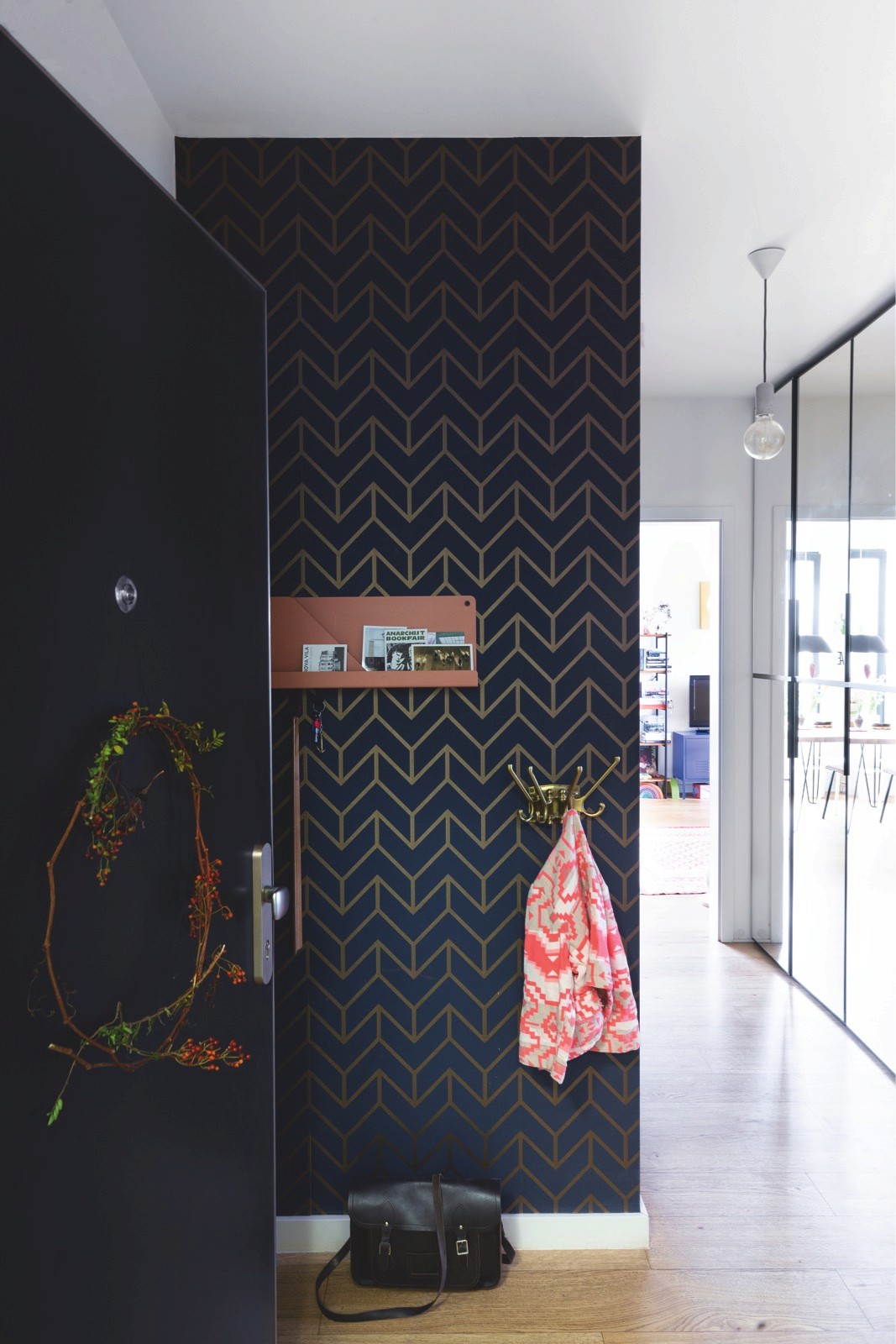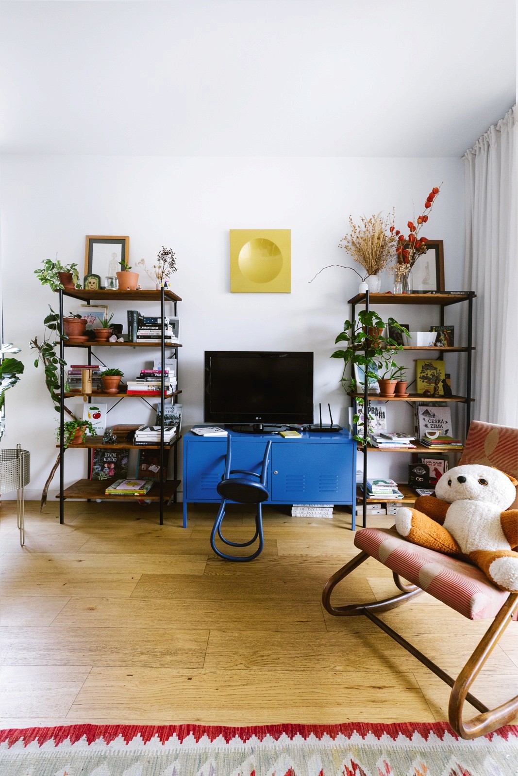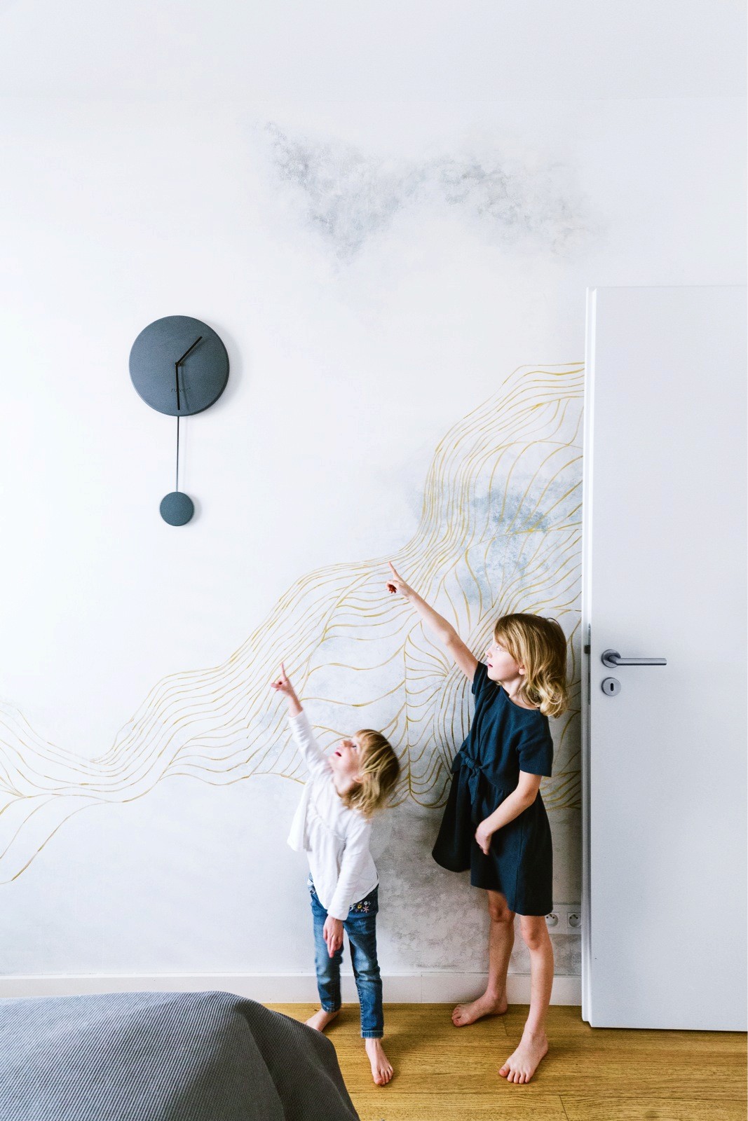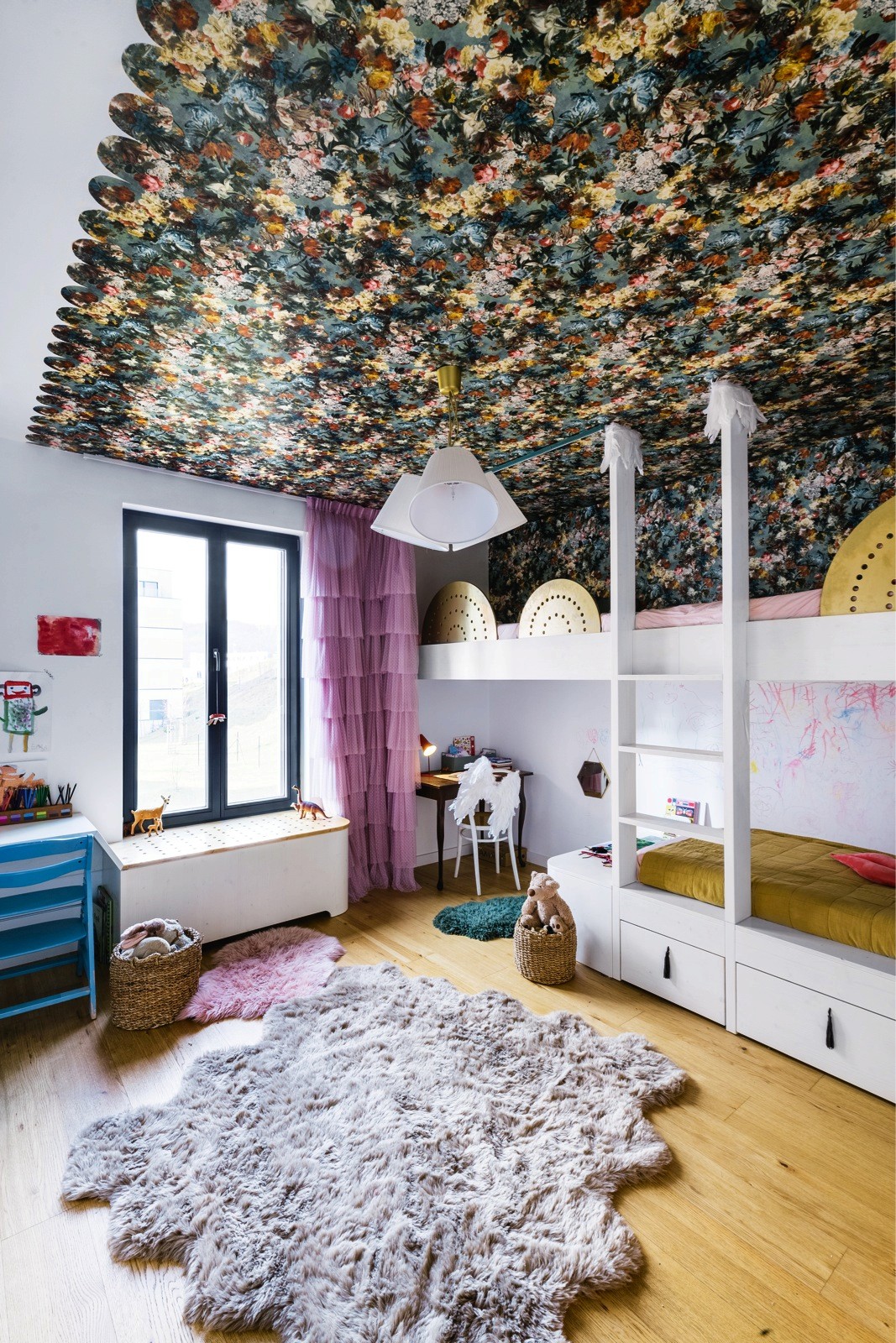 Byt 4+kk v rezidenčním projektu Waltrovka v pražských Jinonicích ukazuje přínosy toho, když se na mě klient - dnes už úžasná kamarádka - obrátí už ve fázi plánování. Místo druhé koupelny je raději komora a dětský pokoj jsme zvětšili na úkor pracovny. Na řadu přišly i osobité nápady, které se projevily zejména na území dětského pokoje. Jednu stěnu a část stropu pokryla tapeta inspirovaná barokními zátišími. Vznikla tak iluze nočního temného nebe rozsvíceného květinovým vzorem. Tapetu doplňuje závěs, který odděluje dívčí „ložnici“ od zbytku pokoje a originálním způsobem sem vnáší téma krajkových šatů a barokní opulentnosti. V kuchyni se povedlo barevně spojit pestrou směs jídelního nábytku a kosočtverce mozaikového obkladu linky v zateplujícím odstínu karamelové spárovací hmoty. V předsíni jsem nechala opticky zmizet vestavěnou zrcadlovou skříň. Předsíň a pracovnu sjednocuje příbuzný motiv tapet a v ložnici ji navíc doplňuje autorská malba.