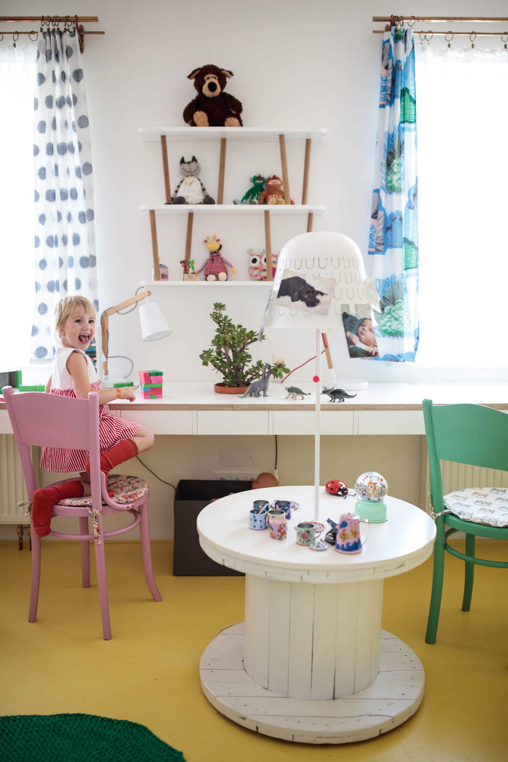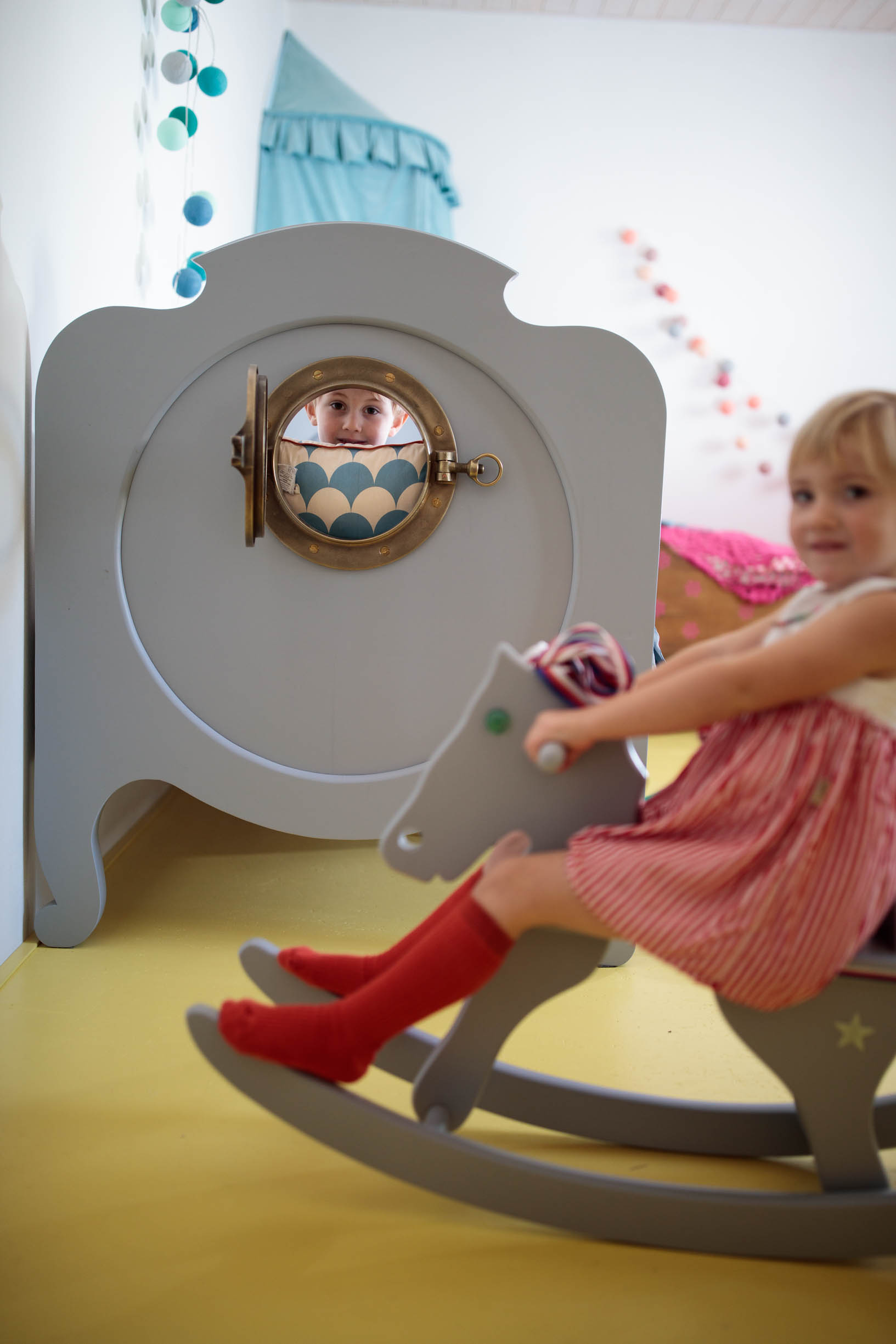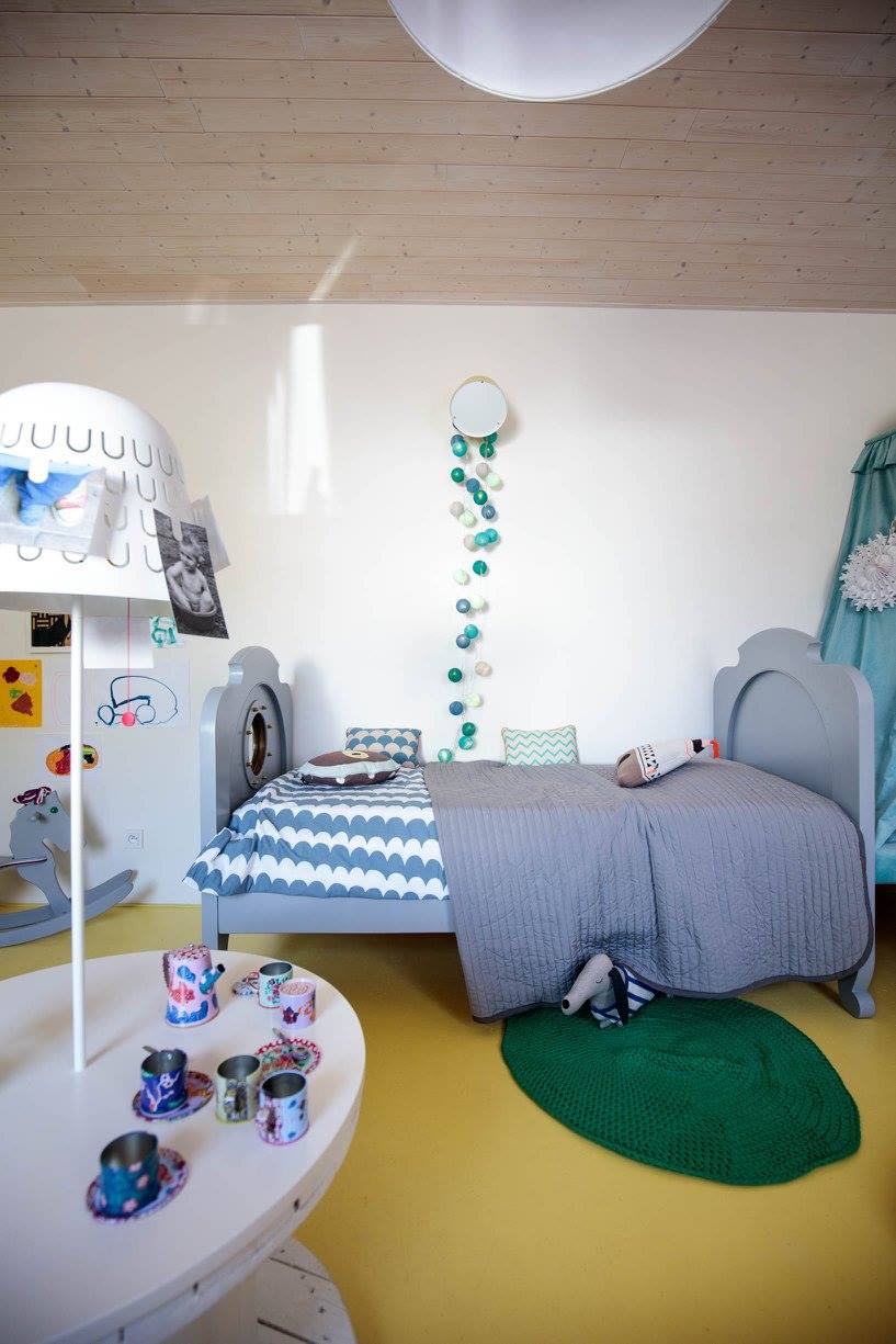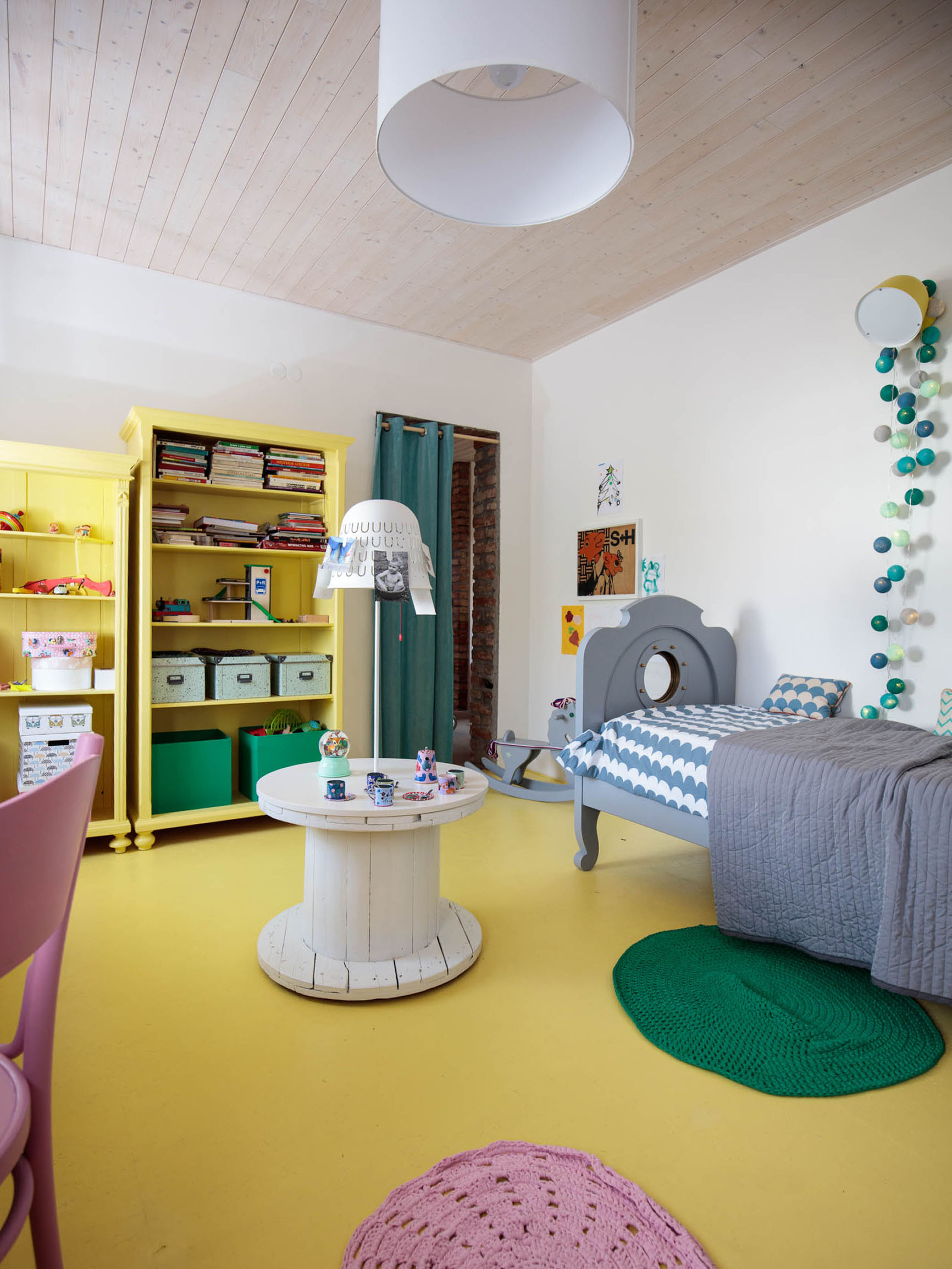 Moji kamarádi, táta umělecký truhlář, máma starající se s láskou o celou rodinu ale i o obecné blaho a krásu místní obce, mě požádali o pomoc s pokojem pro jejich tehdy dvě děti. Pokoj je situovaný na sever, což byl jeden z důvodů světlých barev a podlahy z OSB desek natřených pastelově žlutou barvou. Celková pestrost řešení dokresluje společenskou a přátelskou povahu této rodiny. Využili jsme historizující masivní postele a každé z nich vnukli novou podobu - dýhovaná dostala nový šedý nástřik a dubovou zdobí frézované květy a tradiční lidový motiv ptáčků na vnitřním čele. Pro dospělé jsou postele sice trochu kratší, pro děti ale akorát. Šedá se navíc opticky prodloužila otvíracím mosazným lodním okénkem. V rohu mezi postelemi je baldachýn na míru včetně čalouněného dna ve výšce matrací. Do jednotné žluté jsme natřeli i historizující skříně, které už v nové podobě otevřených knihoven nepotřebují dvířka. Precizně vyrobený stůl a police v bílé barvě s dubovými doplňky má estetické děrování průduchů radiátorů, praktické otvory na vystavení mečů a barevně odlišená dna šuplíků. Bílý stůl z kabelové špulky doplněný o lampu nechává vyniknout židličkám a textilním doplňkům. Repasovaný houpací kůň je tu také prý radši než ve stáji.