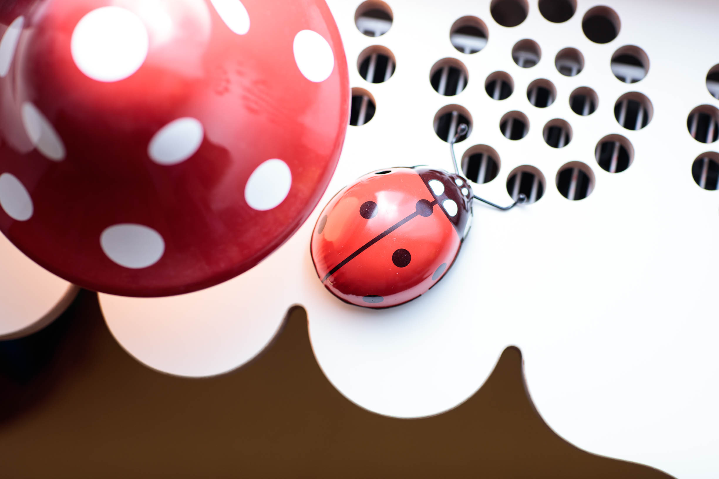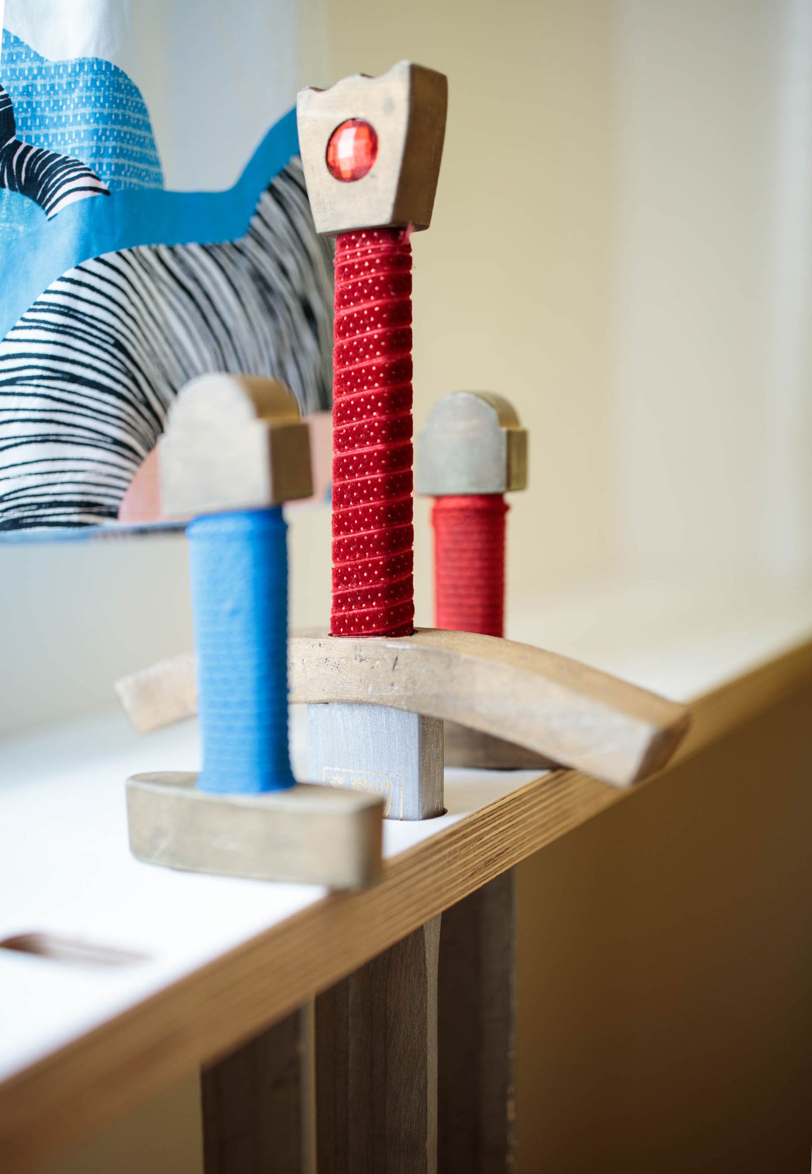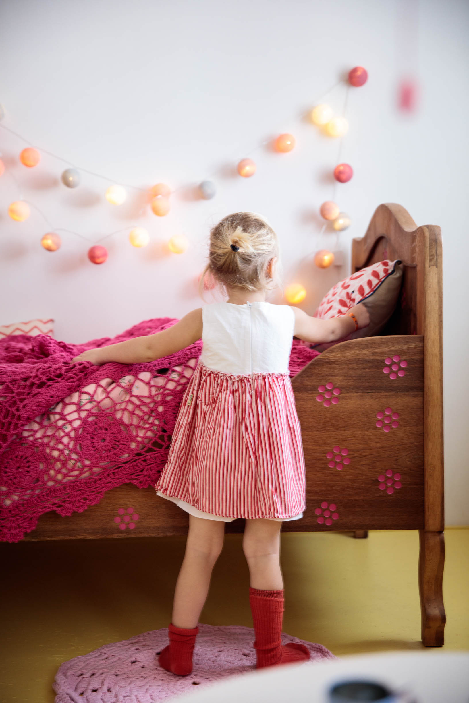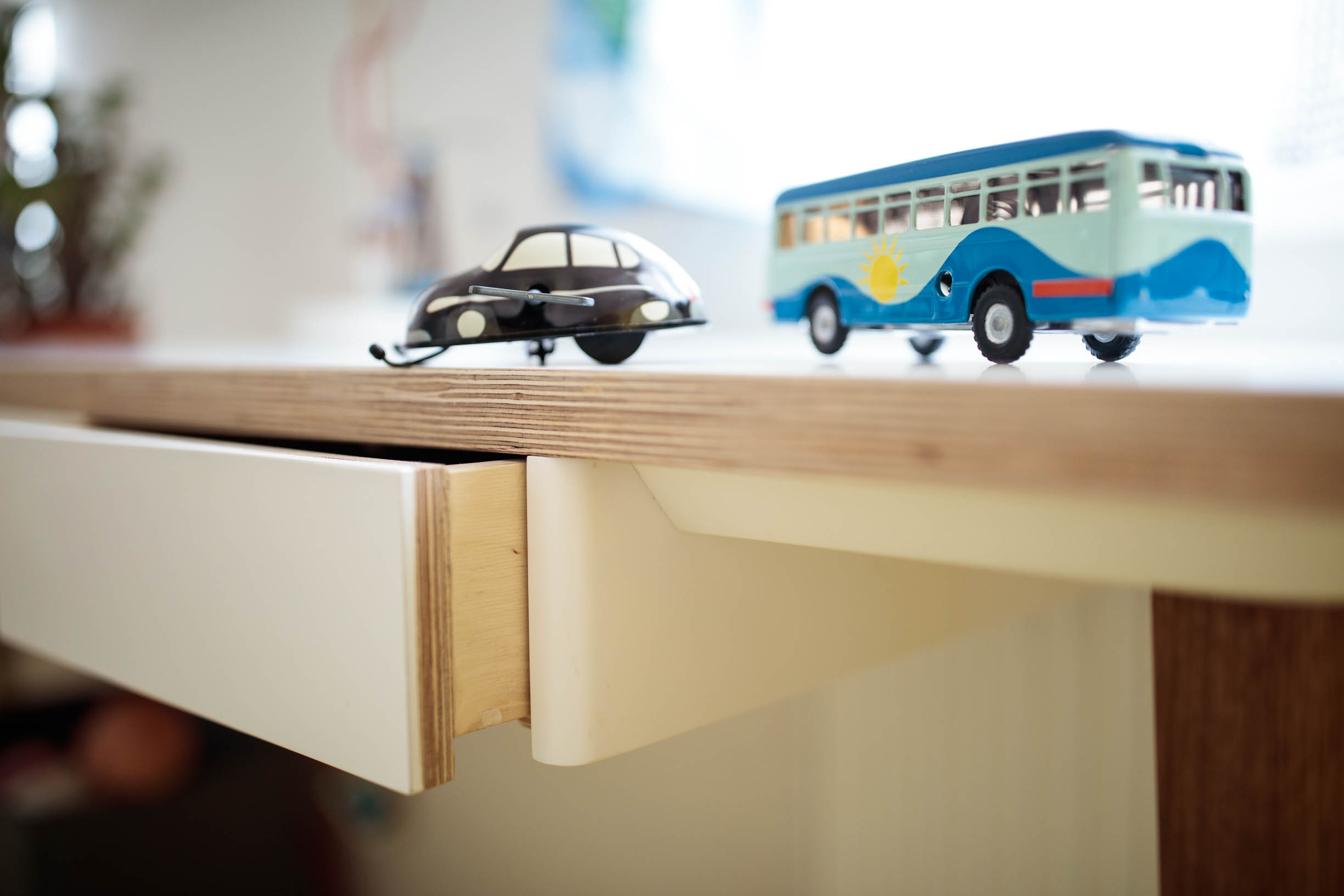 Moji kamarádi, táta umělecký truhlář, máma starající se s láskou o celou rodinu ale i o obecné blaho a krásu místní obce, mě požádali o pomoc s pokojem pro jejich tehdy dvě děti. Pokoj je situovaný na sever, což byl jeden z důvodů světlých barev a podlahy z OSB desek natřených pastelově žlutou barvou. Celková pestrost řešení dokresluje společenskou a přátelskou povahu této rodiny. Využili jsme historizující masivní postele a každé z nich vnukli novou podobu - dýhovaná dostala nový šedý nástřik a dubovou zdobí frézované květy a tradiční lidový motiv ptáčků na vnitřním čele. Pro dospělé jsou postele sice trochu kratší, pro děti ale akorát. Šedá se navíc opticky prodloužila otvíracím mosazným lodním okénkem. V rohu mezi postelemi je baldachýn na míru včetně čalouněného dna ve výšce matrací. Do jednotné žluté jsme natřeli i historizující skříně, které už v nové podobě otevřených knihoven nepotřebují dvířka. Precizně vyrobený stůl a police v bílé barvě s dubovými doplňky má estetické děrování průduchů radiátorů, praktické otvory na vystavení mečů a barevně odlišená dna šuplíků. Bílý stůl z kabelové špulky doplněný o lampu nechává vyniknout židličkám a textilním doplňkům. Repasovaný houpací kůň je tu také prý radši než ve stáji.