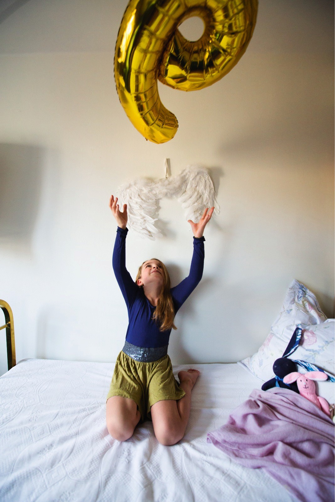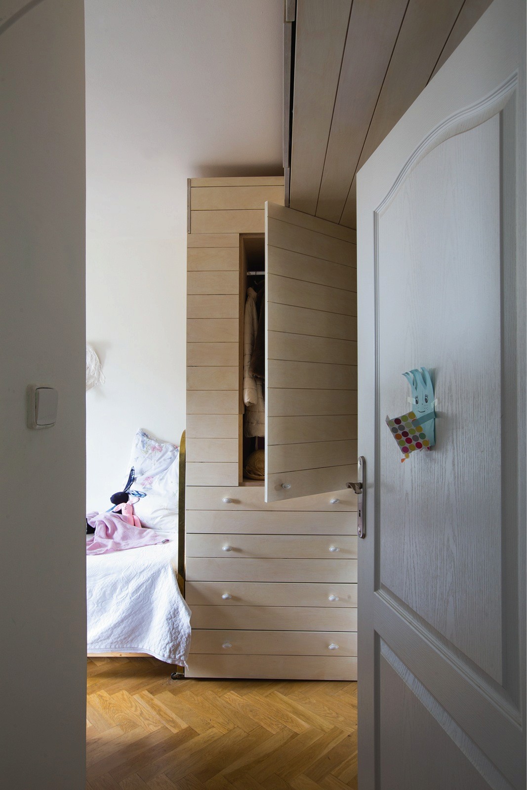 Představa, že si všechny devítileté holčičky přejí bydlet v růžovém pokojíčku, je mírně řečeno stejně stereotypní jako přesvědčení, že nový pokoj může vzniknout jenom z nových věcí. Vytvořila jsem koncept se zapojením řady původních věcí pokoje. Kromě klasických kosmetických úprav v podobě natření a barevného sjednocení kousků „každý pes jiná ves“ došlo i na odvážnější řešení, které si vyžádalo součinnost spřáteleného truhláře. Klasická dvoudveřová skříň tak například přišla o dolní šuplíky, které byly odříznuty a nahrazeny soustruženými nožičkami. Truhlář šuplíky pak znovu použil při up-cyklaci staronového pracovního stolu, který dostal i novou pracovní desku, a nakonec ho modrý nátěr názorově sjednotil se zbytkem pokoje. Proměnit pokoj v elegantní nostalgický budoár pomohly originální kousky z bazaru – mosazná postel, křišťálový lustr a ikonická thonetka. Dotek ženskosti sem dodal tmavě modrý závěs s florálním motivem. Na míru navržená vestavěná šatní skříň z březové překližky je sice v tomto prostoru nejmasivnějším kouskem nábytku, díky frézování ale působí lehce, skoro neviditelně.