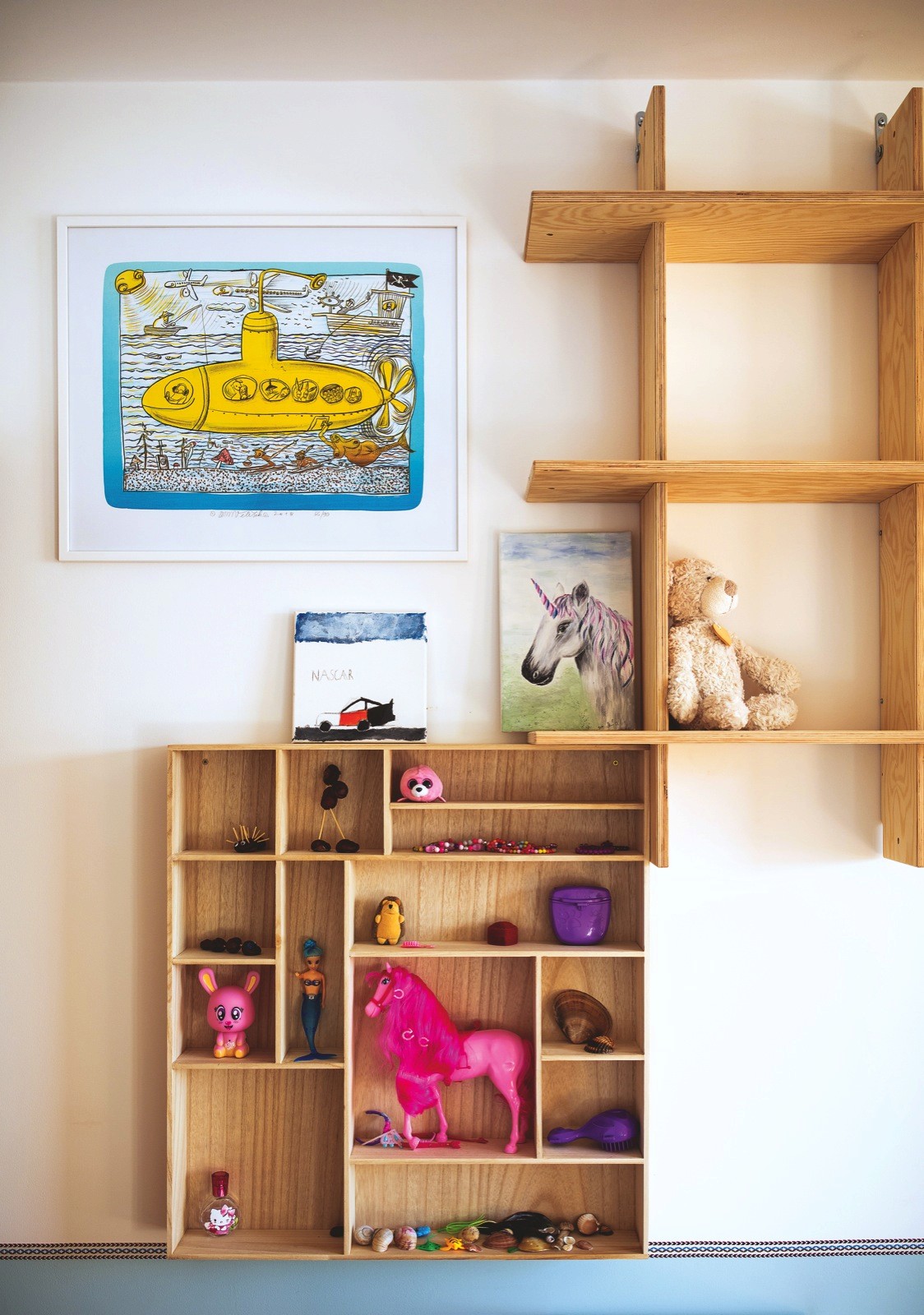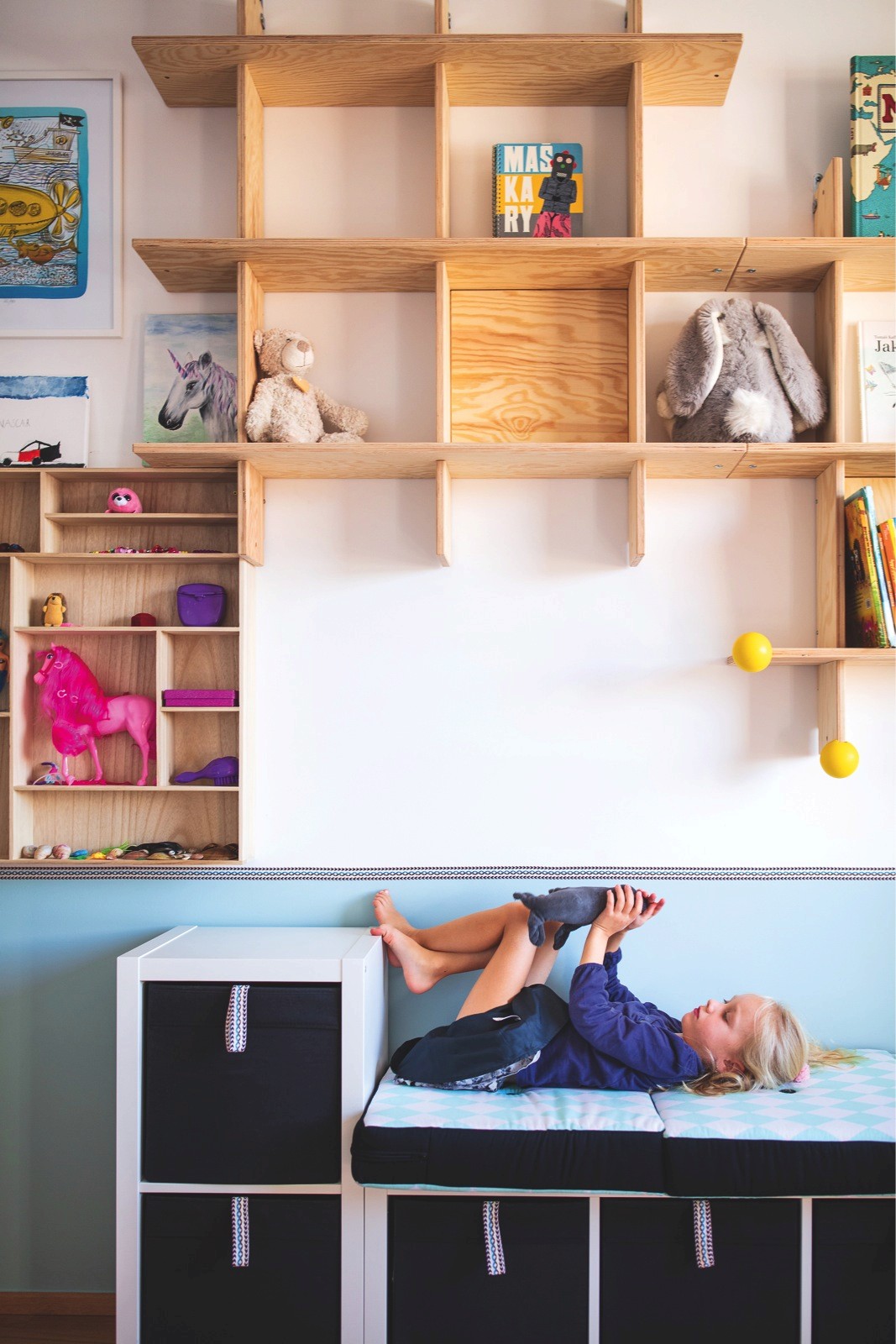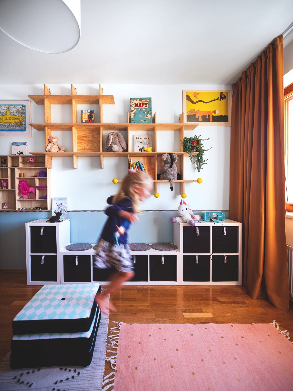 Základem této proměny byl pokoj s již instalovanými zlatohnědými závěsy a hotovou vestavěnou skříní z kvalitního lamina, která tu vyřešila úklid hlavně oblečení jednou provždy. Bylo potřeba vymyslet, jak se z tohoto solidního pokoje rychle dostat do dětské fantazie – přívětivého lesa, tedy přesněji do podzimní doubravy, v níž postupně zapadá slunce a potichu ubývají barvy? Díky papírové tapetě a pohledu na zlatavé závěsy, které se zrcadlí v dubové podlaze, se stačí zasnít a tiše vstoupit mezi stromy. Ztratit se mezi zvířaty, která tu bivakují ve větvích stromů schovaná v budkách, v dutinách či v hodinách… A pod stromy v listí dvě velká doupata – zvláštní úkryty pro děti – holku a kluka, každý jiný. Zatímco střídavě éterická a dynamická Ela přespává v létajícím křehkém hnízdečku (drátěném a zářivě žlutém), Filipův pelíšek je zemitý jako bytelné borové sáně. A tyhle dvě rozdílné postýlky tu spolu sousedí ukryté v lesní harmonii, která jako by začínala přímo tady, za zdí modřanského bytu…