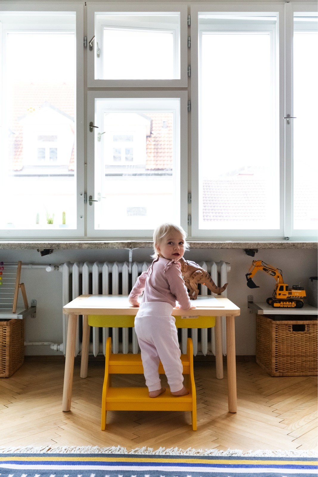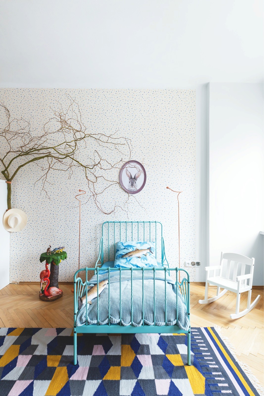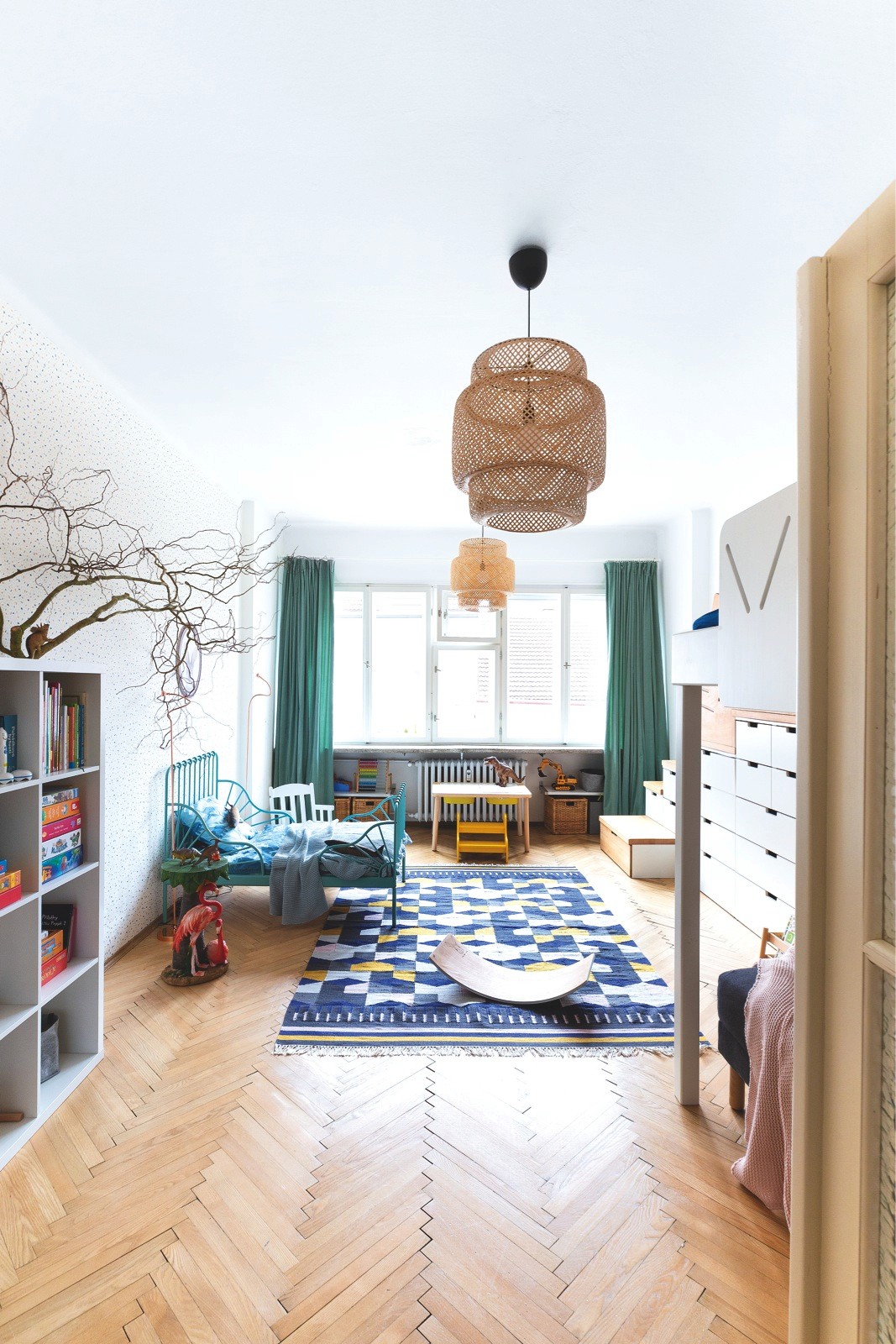 Ve chvíli, kdy si nezávislá dvojice bohémů a nadšených pěstounů pořídila postupně tři děti, brzy bylo potřeba vyřešit, jaký vhodný prostor každému vymyslet. V návrhu dětského pokoje jsem dostala za úkol uskladnit maximum věcí, vytvořit dostatek prostoru pro svobodnou i terapeutickou hru i přespávání kamarádů. Díky vysokým stropům jsem mohla vytvořit ze soustavy zásuvkových komod schodiště, které rodinný truhlář opatřil zábradlím z bukové překližky evokujícím zalesněný kopec. Vzniknul tak velkorysý úložný prostor i přístupová cesta k patru na spaní, kde táboří oba chlapci. Jejich dvoupostel zároveň „zastřešuje“ pohovku, která slouží k odpočinku všem třem dětem a je i útočištěm pro návštěvy. Zatímco kluci spí na vršku s výhledem, jejich malá sestřička dostala novou krajkovou postýlku na protilehlé straně místnosti. Holčičí území hlídá velká kadeřavá větev z kroucené vrby a nad hlubokým spánkem tu bdí králík Petr, jehož portrét visí nad postýlkou.